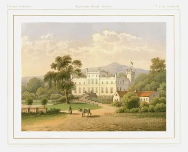 Historia siedziby sięga średniowiecza: pierwsza wzmianka o miejscowości pochodzi z 1326 roku, a wokół połowy XVI wieku wzniesiono kamienną wieżę mieszkalną o planie kwadratu (6,5 m x 6,5 m) i trzech kondygnacjach, otoczoną mokrą, miejscami podwójną fosą. Po kolejnych przebudowach, zwłaszcza neogotyckiej metamorfozie w połowie XIX wieku, pałac zyskał dekoracyjne wieżyczki i ceglane schodki krenelażu — fragmenty tych detali są dziś nadal widoczne w ruinie.